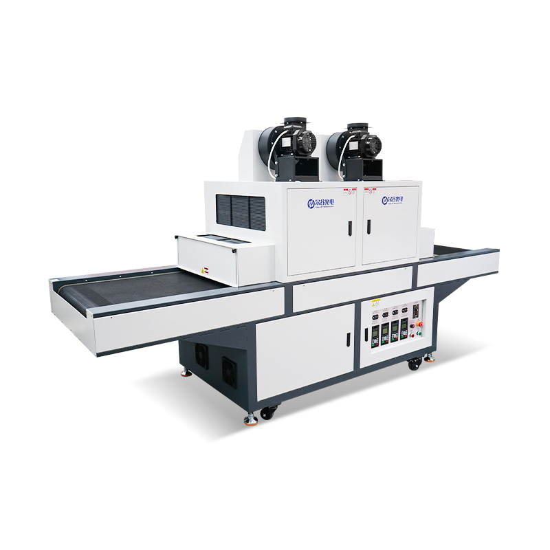 UV固化炉配 4 支 5.6KW 汞灯,顶部向下照射,波长 200-450nm(峰值 365nm),输入 380V,功率20-100%可调,每支灯可单独控制。支持定制,高效满足各类 UV涂料固化需求。